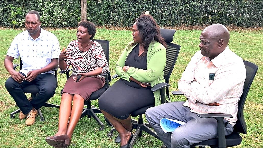 From Left: The late Jackson Kibor’s children, Mr Albert Kibor, Ms Magdaline Kibor, and Ms Loise Kibor, accompanied by Eldoret-based human rights activist Mr Kimutai Kirui (right) addressing journalists in Eldoret, Uasin Gishu County. Kibor’s children are advocating for an out-of-court settlement in the dispute over their late father's multi-billion property. Photo/Jeremiah Choge